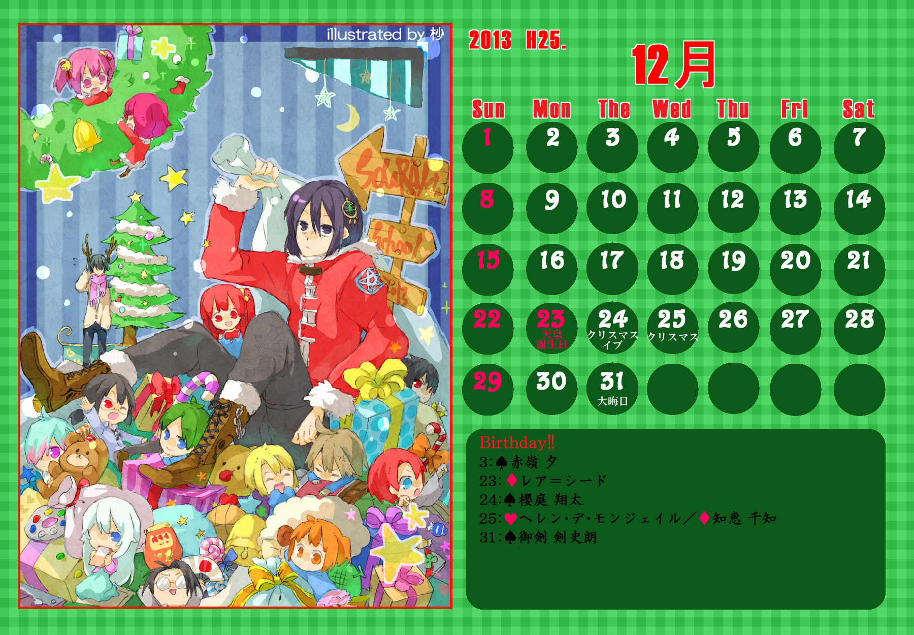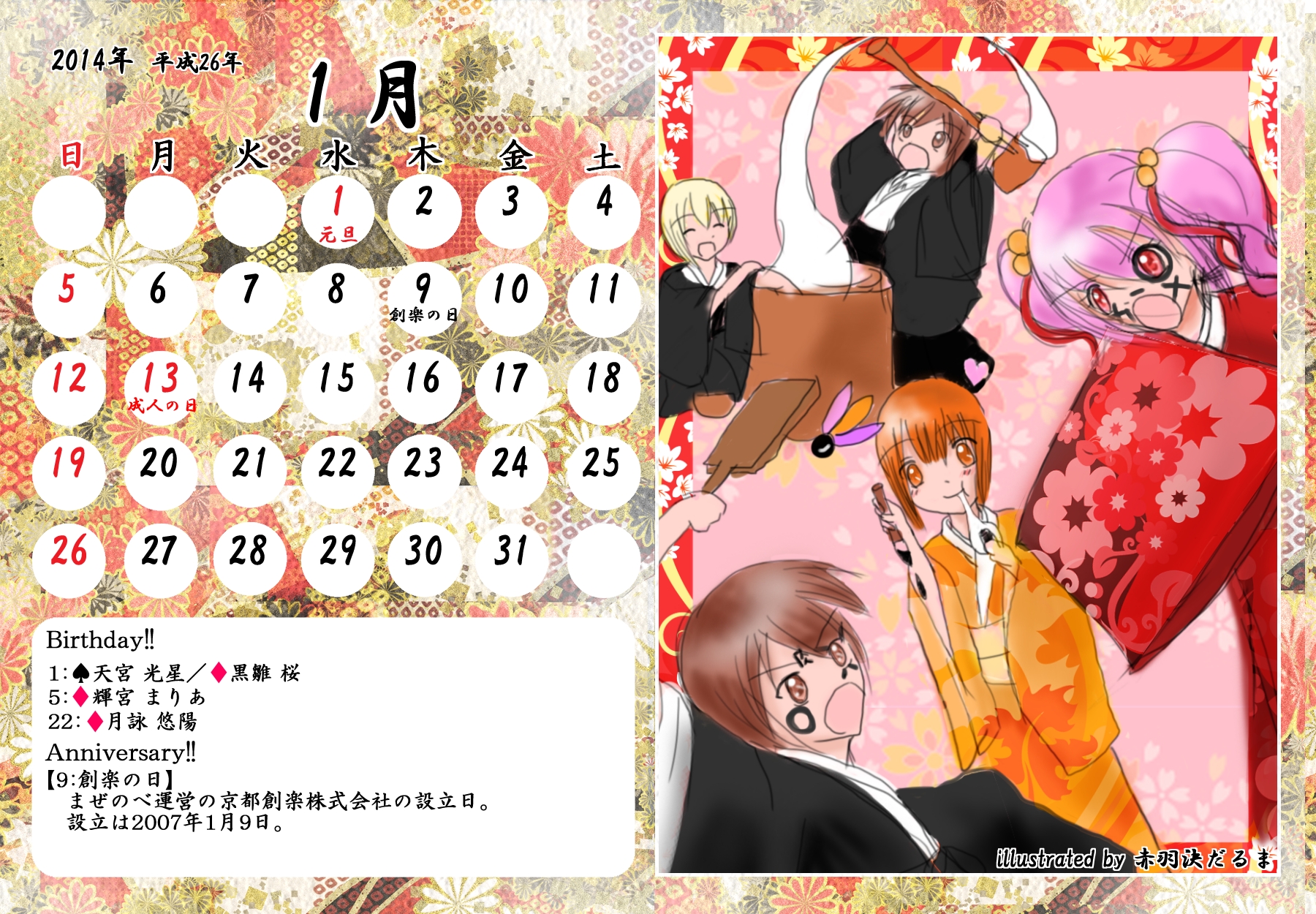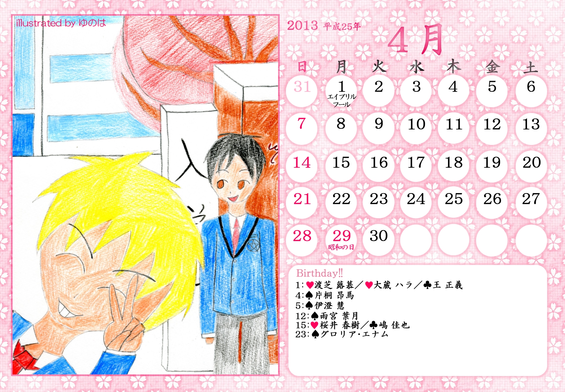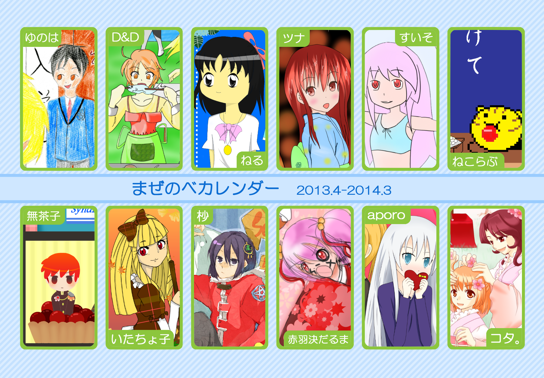 【完成】まぜのべカレンダー2013! 完成品 2013年05月14日 皆様方のご参加およびご協力のおかげで、 ついに! まぜのべカレンダー2013が完成しました! ――12月まで含めて完全に完成です! 完成品は下の「つづきはこちら」を展開で掲載しておりますが、 そちらをご覧になる前に、一応こちらの諸注意に目を通してください。 【使用上の諸注意】 こちらの企画は一個人である無茶子が企画し、 まぜのべ内有志の参加と協力によって非公式に企画されたものです。 ここには、こちらで配布するカレンダーを使用されるにあたって 重要な諸条項をいくつか記します。 以下の条項に同意いただける方のみ、この条項の範囲内でご使用ください。 (1)それぞれのカレンダーの著作権は基本的に、 イラスト部分はその月のイラストを描いて下さった方、 テクスチャ素材を使用している場合は素材提供者様にあります。 (2)使用する際はあくまで個人的使用の範囲に留めてください。 こちらはフリー配布素材ではありません。 ⇒○例:印刷して部屋に飾る、PCのデスクトップ壁紙にする ⇒×例:自分のHPに無断で掲載する、pixiv等のSNSサイトに無断で投稿する、何らかの素材として使用する 枠部分にフリー素材を使用している都合上、 基本的にその月の担当絵師様でも、カレンダーそのものの扱いは上記の範囲内でお願いします! もちろんイラスト部分に関しては完全に担当絵師様の著作物ですので、 その月の担当絵師さんに関してはこちらはあてはまりません。 【お詫びとお知らせ】 当初は全部pngで上げようと思っていたのですが、 一部アップロード上限の関係でjpegになってしまったものがあります。 一応最低圧縮なので、そんなに画質は落ちていない(見た目はほぼわかんない) &印刷するのであれば縮小されるので全く問題ないとは思うのですが、 もしご希望あればメール等でpngをお送りしますので、お申し付けください! 本当すいません~m(_ _;)m あと、誕生日の記号についてですが、 ハート:女子生徒 スペード:男子生徒 ダイヤ:女性の先生 クラブ:男性の先生 これも当初は「女の子」なのに「男の子」なキャラだったら色を変えて〜 とか言ってたんですが、全員生物学的な性別で統一させてもらいました! ちょっと調べてみてたんですが意外とそういうキャラが多くて、 チェックコストがかかるので……申し訳ありません〜! 以上にご了承頂けましたら、つづき展開お願いします! クリックで印刷原寸大表示します。 ■表紙(完全完成ver.) 12月分も無事埋まり、にぎやかに! ■2013年3月:イラスト担当ゆのはさん 入学式の一枚、的な! 二人の創楽学園入学が楽しみですね♪ ■2013年5月:イラスト担当D&Dさん 5月誕生日の子たち集合! わいわいバーベキューいいですねぇ(´▽`*) ■2013年6月:イラスト担当ねるさん 六月ですが、じめじめさせずにさわやかなイメージで仕上がってます! あけみん可愛いよ、あけみん! ■2013年7月:イラスト担当ツナさん 夏祭りの楽しそうな雰囲気が素敵です! みんなの浴衣も可愛すぎるvV ■2013年8月:イラスト担当すいそさん こちらもまた違った夏の良さ、海水浴?プール? ひなちゃんはお兄ちゃんときゃっきゃうふふできれば、どっちでも関係ない! ■2013年9月:イラスト担当ねこらぶさん 見上げるマルとらが可愛すぎますvV もっふもふしたい!でも団子食べる時はホイッスル外しなさいね!! ■2013年10月:イラスト担当無茶子 ハロウィンなのでお菓子をと各キャラのイメージカラーでお菓子を描いてみたけど、 リコリスその青いのなんやねん……(※でも実在するジャムです!) ■2013年11月:イラスト担当いたちょ子さん 提出までにPV仕上げると意気込んでたのに仕上がらなかった! 遅くても11月までには仕上げて!ヘンゼルとグレーテル楽しみです!! ■2013年12月:イラスト担当杪さん すごいつめこみ!杪さんの本気を見た! 碓氷トナカイがはまり役かわゆい~(´▽`*) ■2014年1月:イラスト担当赤羽決だるまさん お正月からロリちゃん全力!! 一枚のイラストから個性がにじみ出ててすごいですv ■2014年2月:イラスト担当aporoさん こんな可愛い子がチョコをくれるはずない!!(ネガティブ) 二人ともかわゆすvV ■2014年3月:イラスト担当コタ。さん 華やか!!の一言に尽きる!!女の子のお祭り、いいなぁvV そして某姫さまは通常運転ですね……! ■記念日作成に協力して頂いた方々 ものん††めとろさん/もぐじらさん/コタ。さん/ねこらぶさん ありがとうございました! ◆印刷する場合 まずは原寸大画像を自分のPCにローカル保存してください。 サイズはハガキサイズを想定していますので、ハガキサイズの用紙に印刷してください。 印刷設定する際は、四辺フチなし印刷の設定をしてください。 (お好みでOKですが、一応それを想定してハガキサイズよりも若干はみ出したサイズで作成しています) PR