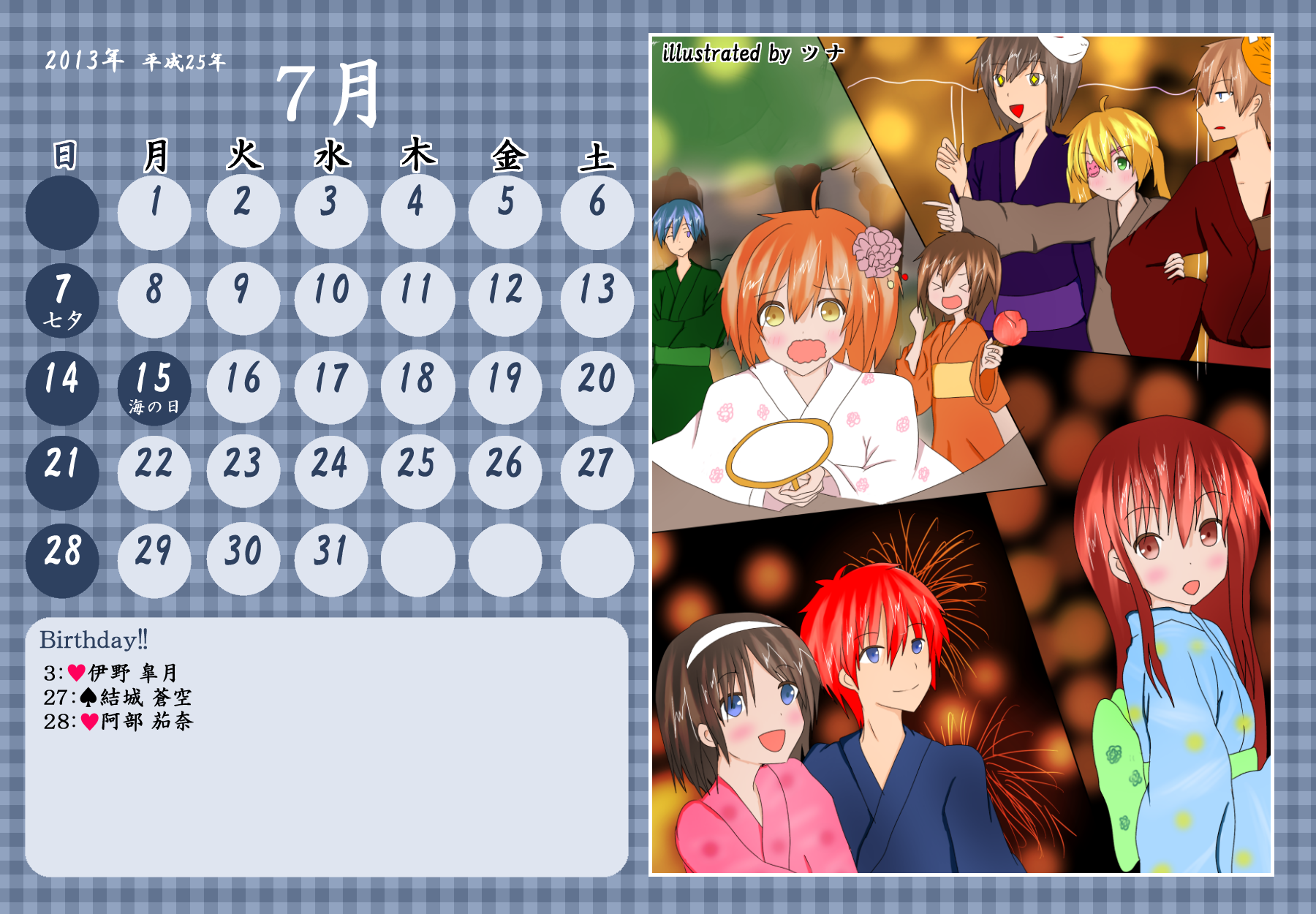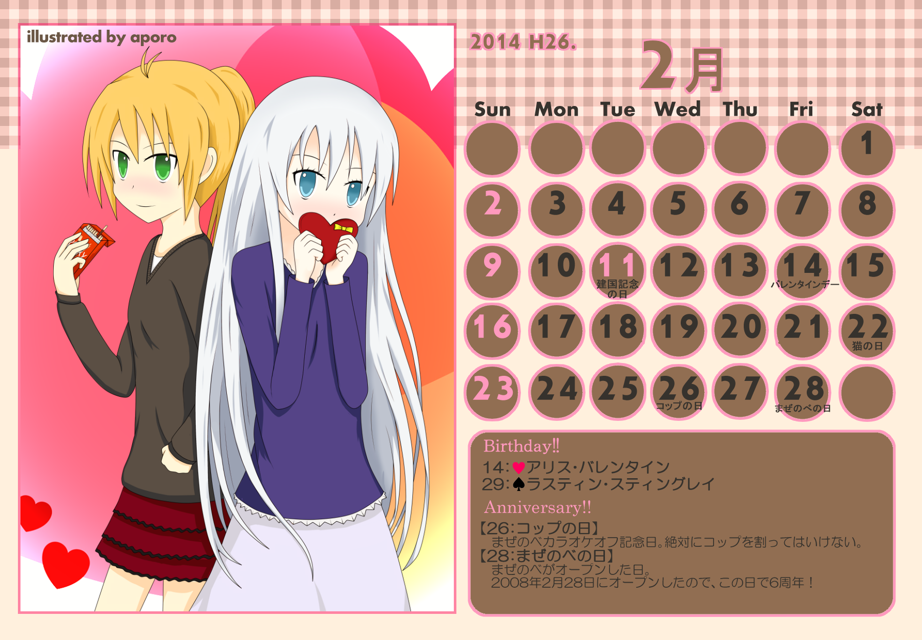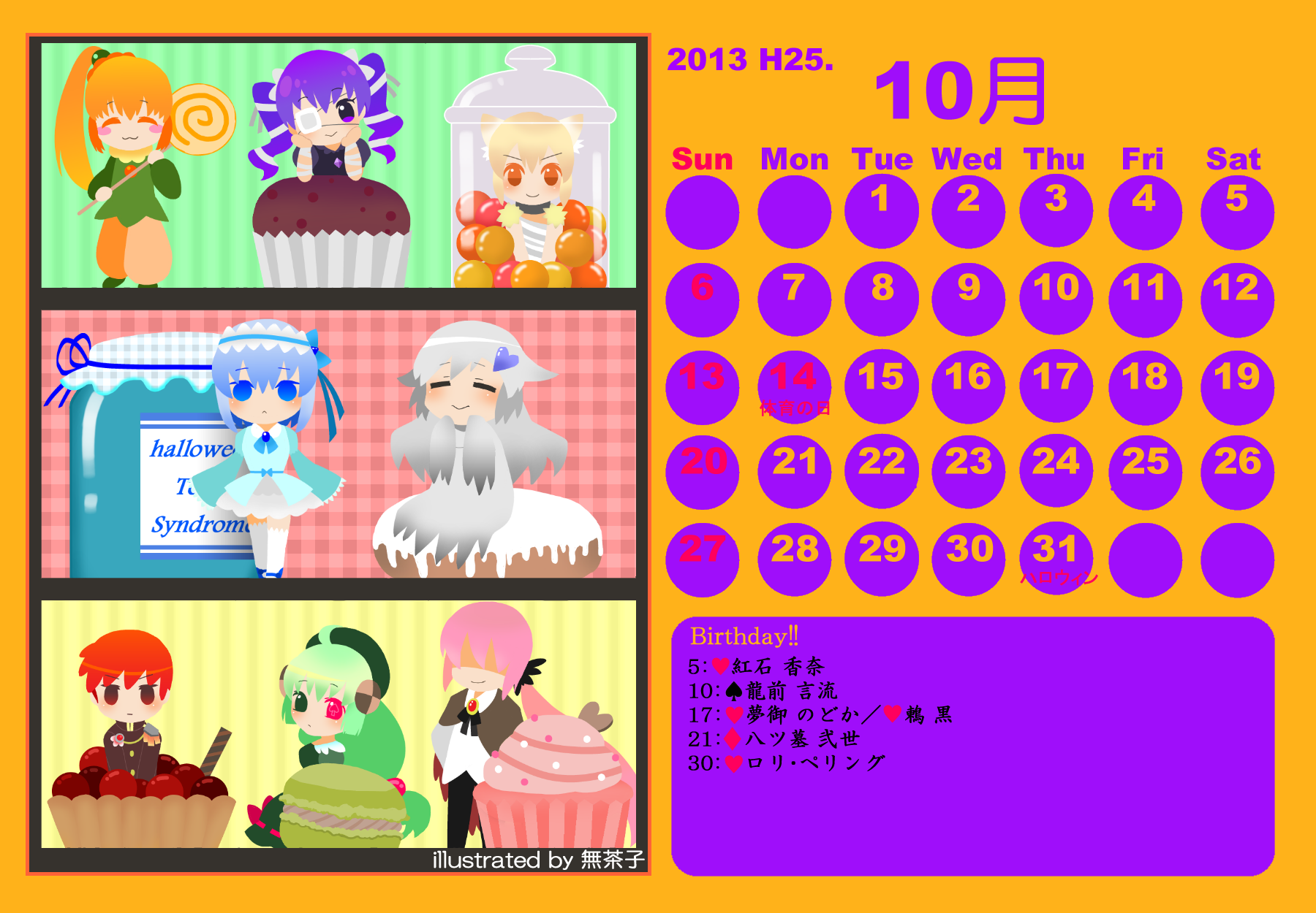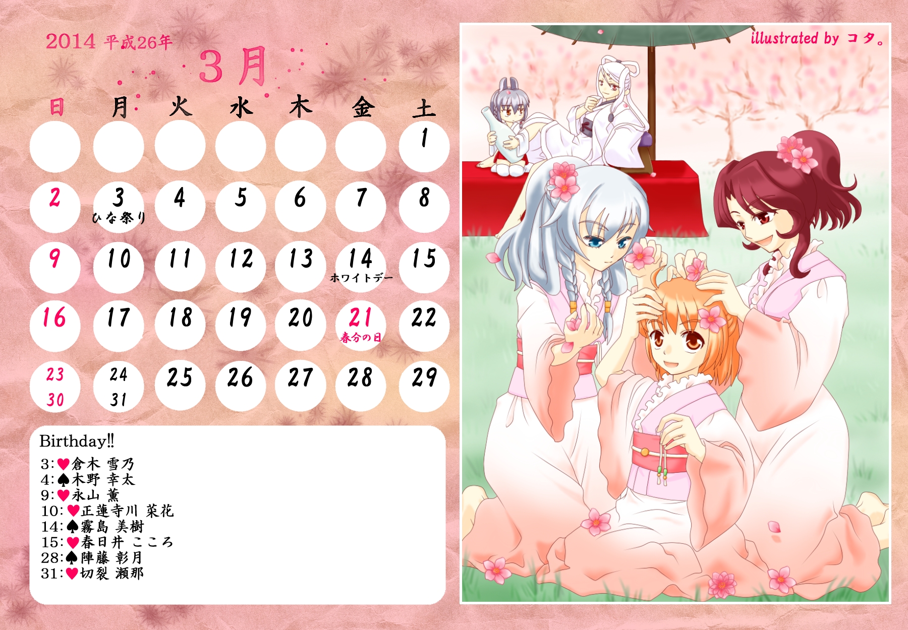 【完成】まぜのべカレンダー2013! 完成品 2013年05月14日 皆様方のご参加およびご協力のおかげで、 ついに! まぜのべカレンダー2013が完成しました! ――12月まで含めて完全に完成です! 完成品は下の「つづきはこちら」を展開で掲載しておりますが、 そちらをご覧になる前に、一応こちらの諸注意に目を通してください。 【使用上の諸注意】 こちらの企画は一個人である無茶子が企画し、 まぜのべ内有志の参加と協力によって非公式に企画されたものです。 ここには、こちらで配布するカレンダーを使用されるにあたって 重要な諸条項をいくつか記します。 以下の条項に同意いただける方のみ、この条項の範囲内でご使用ください。 (1)それぞれのカレンダーの著作権は基本的に、 イラスト部分はその月のイラストを描いて下さった方、 テクスチャ素材を使用している場合は素材提供者様にあります。 (2)使用する際はあくまで個人的使用の範囲に留めてください。 こちらはフリー配布素材ではありません。 ⇒○例:印刷して部屋に飾る、PCのデスクトップ壁紙にする ⇒×例:自分のHPに無断で掲載する、pixiv等のSNSサイトに無断で投稿する、何らかの素材として使用する 枠部分にフリー素材を使用している都合上、 基本的にその月の担当絵師様でも、カレンダーそのものの扱いは上記の範囲内でお願いします! もちろんイラスト部分に関しては完全に担当絵師様の著作物ですので、 その月の担当絵師さんに関してはこちらはあてはまりません。 【お詫びとお知らせ】 当初は全部pngで上げようと思っていたのですが、 一部アップロード上限の関係でjpegになってしまったものがあります。 一応最低圧縮なので、そんなに画質は落ちていない(見た目はほぼわかんない) &印刷するのであれば縮小されるので全く問題ないとは思うのですが、 もしご希望あればメール等でpngをお送りしますので、お申し付けください! 本当すいません~m(_ _;)m あと、誕生日の記号についてですが、 ハート:女子生徒 スペード:男子生徒 ダイヤ:女性の先生 クラブ:男性の先生 これも当初は「女の子」なのに「男の子」なキャラだったら色を変えて〜 とか言ってたんですが、全員生物学的な性別で統一させてもらいました! ちょっと調べてみてたんですが意外とそういうキャラが多くて、 チェックコストがかかるので……申し訳ありません〜! 以上にご了承頂けましたら、つづき展開お願いします! クリックで印刷原寸大表示します。 ■表紙(完全完成ver.) 12月分も無事埋まり、にぎやかに! ■2013年3月:イラスト担当ゆのはさん 入学式の一枚、的な! 二人の創楽学園入学が楽しみですね♪ ■2013年5月:イラスト担当D&Dさん 5月誕生日の子たち集合! わいわいバーベキューいいですねぇ(´▽`*) ■2013年6月:イラスト担当ねるさん 六月ですが、じめじめさせずにさわやかなイメージで仕上がってます! あけみん可愛いよ、あけみん! ■2013年7月:イラスト担当ツナさん 夏祭りの楽しそうな雰囲気が素敵です! みんなの浴衣も可愛すぎるvV ■2013年8月:イラスト担当すいそさん こちらもまた違った夏の良さ、海水浴?プール? ひなちゃんはお兄ちゃんときゃっきゃうふふできれば、どっちでも関係ない! ■2013年9月:イラスト担当ねこらぶさん 見上げるマルとらが可愛すぎますvV もっふもふしたい!でも団子食べる時はホイッスル外しなさいね!! ■2013年10月:イラスト担当無茶子 ハロウィンなのでお菓子をと各キャラのイメージカラーでお菓子を描いてみたけど、 リコリスその青いのなんやねん……(※でも実在するジャムです!) ■2013年11月:イラスト担当いたちょ子さん 提出までにPV仕上げると意気込んでたのに仕上がらなかった! 遅くても11月までには仕上げて!ヘンゼルとグレーテル楽しみです!! ■2013年12月:イラスト担当杪さん すごいつめこみ!杪さんの本気を見た! 碓氷トナカイがはまり役かわゆい~(´▽`*) ■2014年1月:イラスト担当赤羽決だるまさん お正月からロリちゃん全力!! 一枚のイラストから個性がにじみ出ててすごいですv ■2014年2月:イラスト担当aporoさん こんな可愛い子がチョコをくれるはずない!!(ネガティブ) 二人ともかわゆすvV ■2014年3月:イラスト担当コタ。さん 華やか!!の一言に尽きる!!女の子のお祭り、いいなぁvV そして某姫さまは通常運転ですね……! ■記念日作成に協力して頂いた方々 ものん††めとろさん/もぐじらさん/コタ。さん/ねこらぶさん ありがとうございました! ◆印刷する場合 まずは原寸大画像を自分のPCにローカル保存してください。 サイズはハガキサイズを想定していますので、ハガキサイズの用紙に印刷してください。 印刷設定する際は、四辺フチなし印刷の設定をしてください。 (お好みでOKですが、一応それを想定してハガキサイズよりも若干はみ出したサイズで作成しています) PR