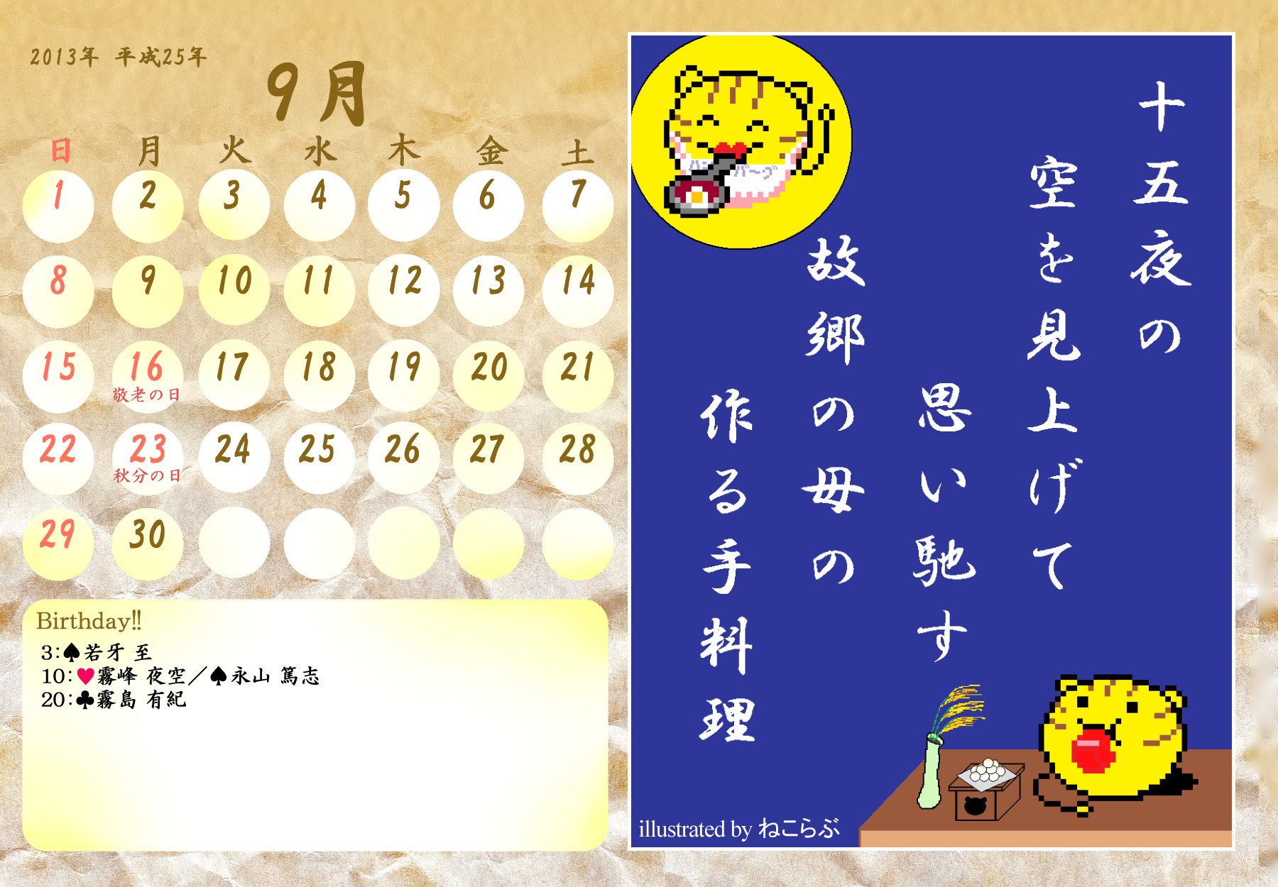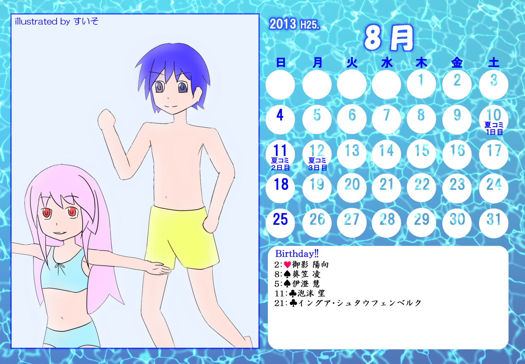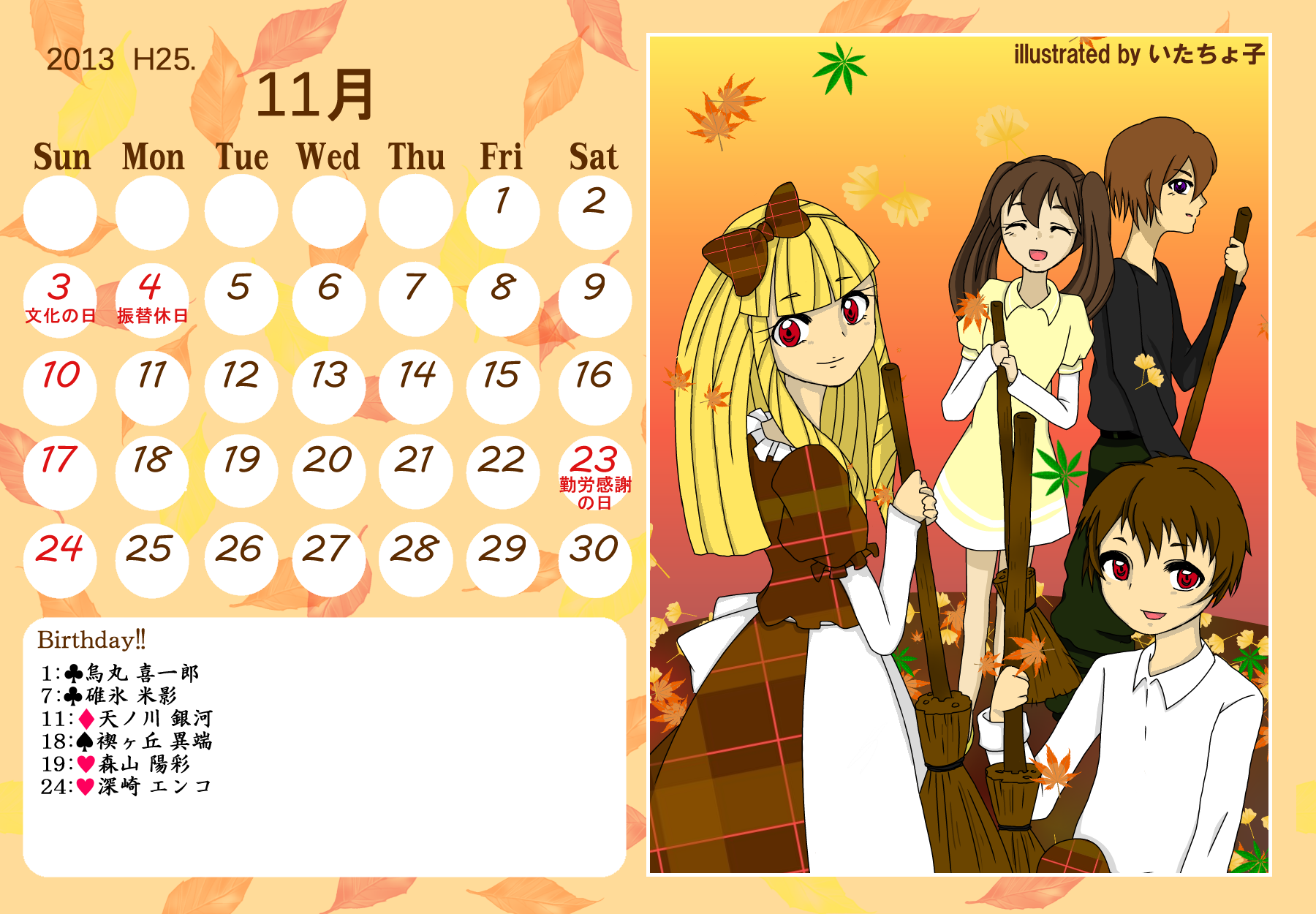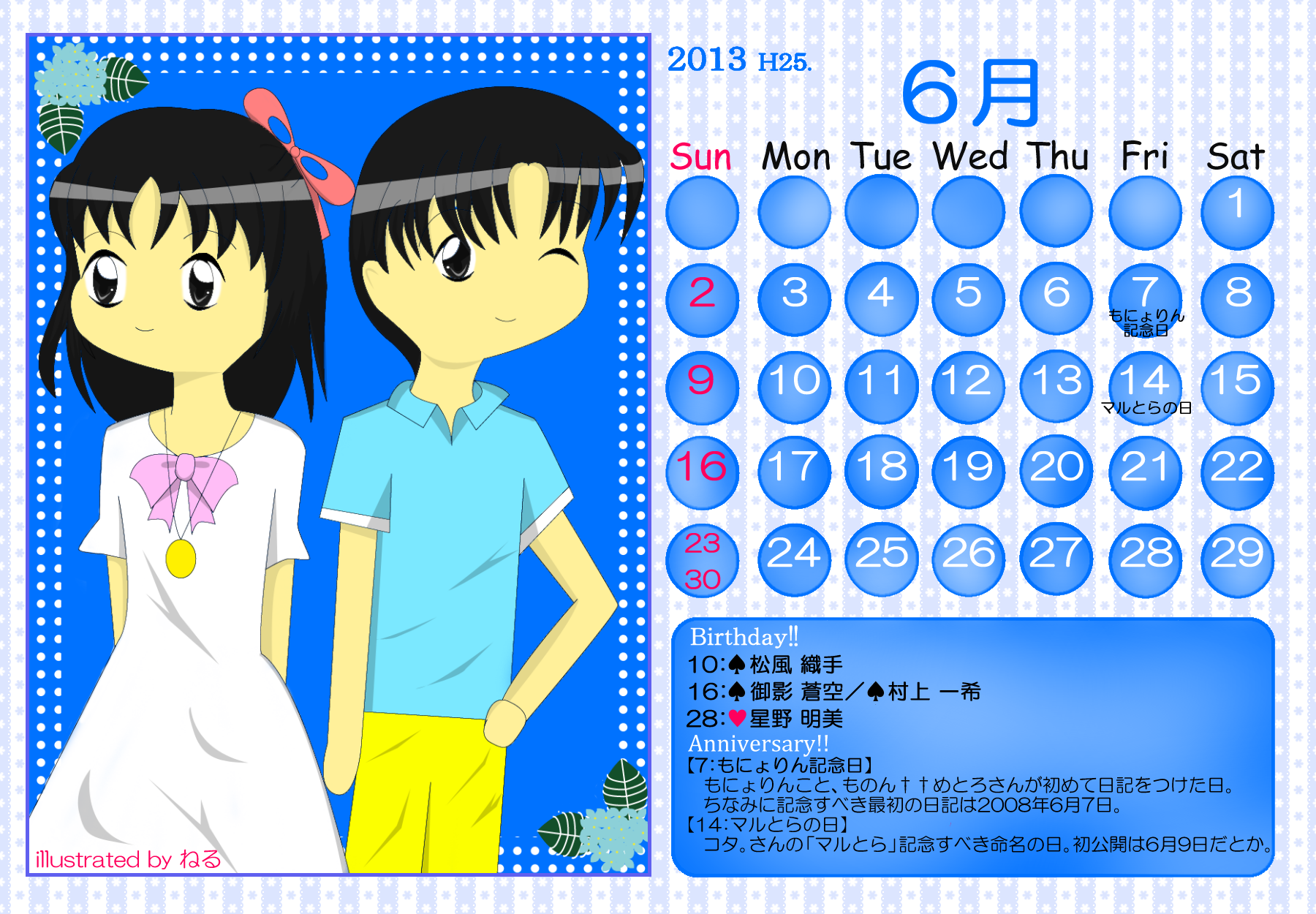 【完成】まぜのべカレンダー2013! 完成品 2013年05月14日 皆様方のご参加およびご協力のおかげで、 ついに! まぜのべカレンダー2013が完成しました! ――12月まで含めて完全に完成です! 完成品は下の「つづきはこちら」を展開で掲載しておりますが、 そちらをご覧になる前に、一応こちらの諸注意に目を通してください。 【使用上の諸注意】 こちらの企画は一個人である無茶子が企画し、 まぜのべ内有志の参加と協力によって非公式に企画されたものです。 ここには、こちらで配布するカレンダーを使用されるにあたって 重要な諸条項をいくつか記します。 以下の条項に同意いただける方のみ、この条項の範囲内でご使用ください。 (1)それぞれのカレンダーの著作権は基本的に、 イラスト部分はその月のイラストを描いて下さった方、 テクスチャ素材を使用している場合は素材提供者様にあります。 (2)使用する際はあくまで個人的使用の範囲に留めてください。 こちらはフリー配布素材ではありません。 ⇒○例:印刷して部屋に飾る、PCのデスクトップ壁紙にする ⇒×例:自分のHPに無断で掲載する、pixiv等のSNSサイトに無断で投稿する、何らかの素材として使用する 枠部分にフリー素材を使用している都合上、 基本的にその月の担当絵師様でも、カレンダーそのものの扱いは上記の範囲内でお願いします! もちろんイラスト部分に関しては完全に担当絵師様の著作物ですので、 その月の担当絵師さんに関してはこちらはあてはまりません。 【お詫びとお知らせ】 当初は全部pngで上げようと思っていたのですが、 一部アップロード上限の関係でjpegになってしまったものがあります。 一応最低圧縮なので、そんなに画質は落ちていない(見た目はほぼわかんない) &印刷するのであれば縮小されるので全く問題ないとは思うのですが、 もしご希望あればメール等でpngをお送りしますので、お申し付けください! 本当すいません~m(_ _;)m あと、誕生日の記号についてですが、 ハート:女子生徒 スペード:男子生徒 ダイヤ:女性の先生 クラブ:男性の先生 これも当初は「女の子」なのに「男の子」なキャラだったら色を変えて〜 とか言ってたんですが、全員生物学的な性別で統一させてもらいました! ちょっと調べてみてたんですが意外とそういうキャラが多くて、 チェックコストがかかるので……申し訳ありません〜! 以上にご了承頂けましたら、つづき展開お願いします! クリックで印刷原寸大表示します。 ■表紙(完全完成ver.) 12月分も無事埋まり、にぎやかに! ■2013年3月:イラスト担当ゆのはさん 入学式の一枚、的な! 二人の創楽学園入学が楽しみですね♪ ■2013年5月:イラスト担当D&Dさん 5月誕生日の子たち集合! わいわいバーベキューいいですねぇ(´▽`*) ■2013年6月:イラスト担当ねるさん 六月ですが、じめじめさせずにさわやかなイメージで仕上がってます! あけみん可愛いよ、あけみん! ■2013年7月:イラスト担当ツナさん 夏祭りの楽しそうな雰囲気が素敵です! みんなの浴衣も可愛すぎるvV ■2013年8月:イラスト担当すいそさん こちらもまた違った夏の良さ、海水浴?プール? ひなちゃんはお兄ちゃんときゃっきゃうふふできれば、どっちでも関係ない! ■2013年9月:イラスト担当ねこらぶさん 見上げるマルとらが可愛すぎますvV もっふもふしたい!でも団子食べる時はホイッスル外しなさいね!! ■2013年10月:イラスト担当無茶子 ハロウィンなのでお菓子をと各キャラのイメージカラーでお菓子を描いてみたけど、 リコリスその青いのなんやねん……(※でも実在するジャムです!) ■2013年11月:イラスト担当いたちょ子さん 提出までにPV仕上げると意気込んでたのに仕上がらなかった! 遅くても11月までには仕上げて!ヘンゼルとグレーテル楽しみです!! ■2013年12月:イラスト担当杪さん すごいつめこみ!杪さんの本気を見た! 碓氷トナカイがはまり役かわゆい~(´▽`*) ■2014年1月:イラスト担当赤羽決だるまさん お正月からロリちゃん全力!! 一枚のイラストから個性がにじみ出ててすごいですv ■2014年2月:イラスト担当aporoさん こんな可愛い子がチョコをくれるはずない!!(ネガティブ) 二人ともかわゆすvV ■2014年3月:イラスト担当コタ。さん 華やか!!の一言に尽きる!!女の子のお祭り、いいなぁvV そして某姫さまは通常運転ですね……! ■記念日作成に協力して頂いた方々 ものん††めとろさん/もぐじらさん/コタ。さん/ねこらぶさん ありがとうございました! ◆印刷する場合 まずは原寸大画像を自分のPCにローカル保存してください。 サイズはハガキサイズを想定していますので、ハガキサイズの用紙に印刷してください。 印刷設定する際は、四辺フチなし印刷の設定をしてください。 (お好みでOKですが、一応それを想定してハガキサイズよりも若干はみ出したサイズで作成しています) PR