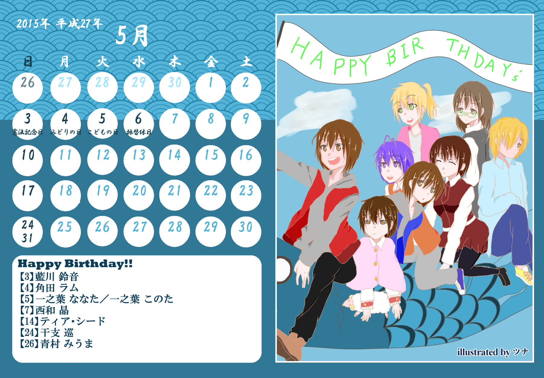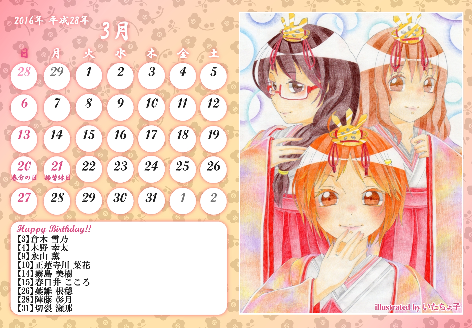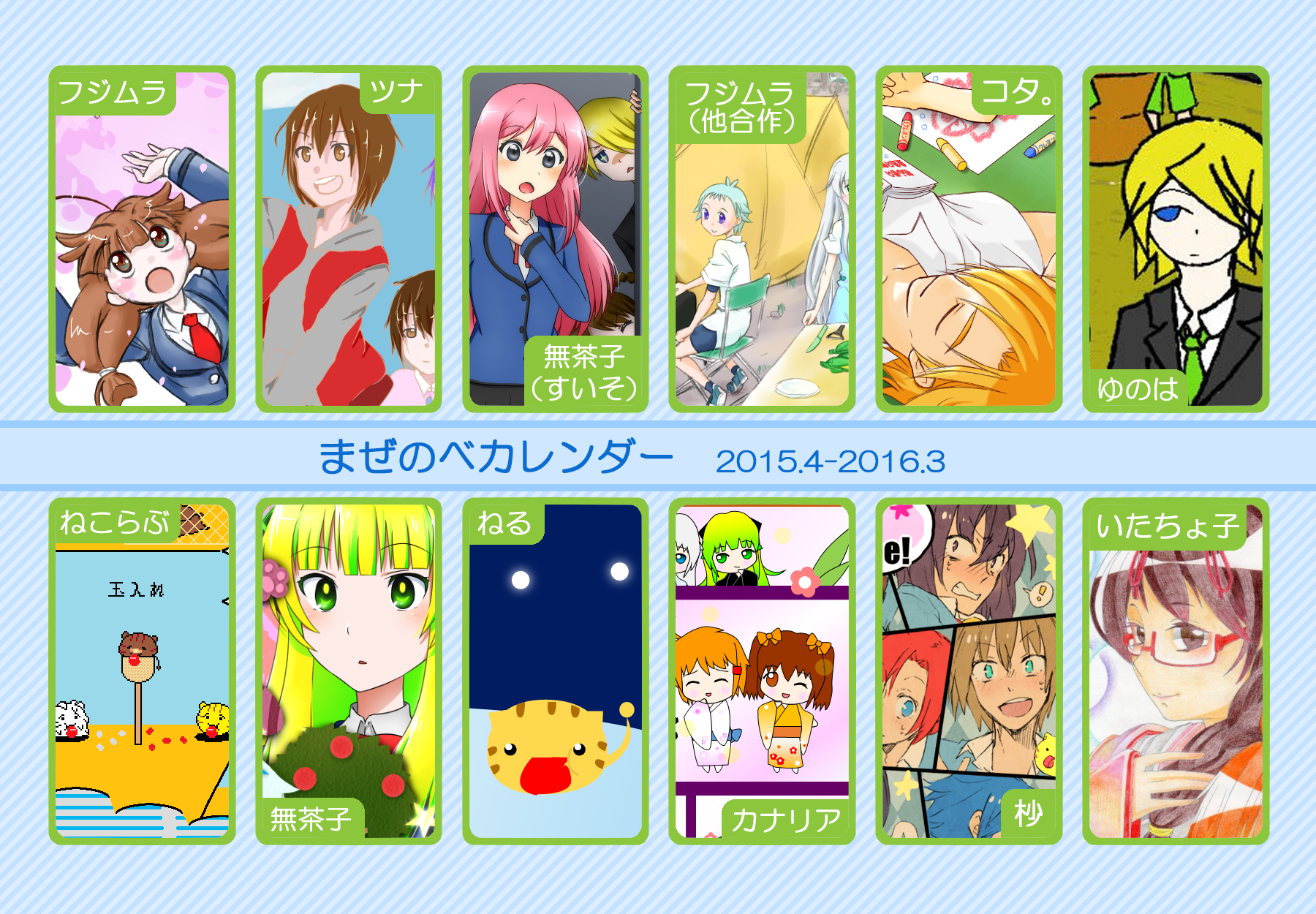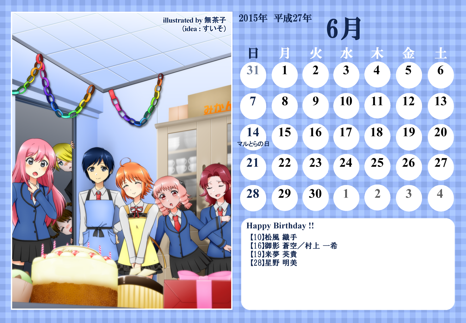 【完成】まぜのべカレンダー2015! 完成品 2015年03月30日 皆様方のご参加およびご協力により、まぜのべカレンダー2015が完成しました!完成品は下の「つづきはこちら」を展開で掲載しておりますので、ご確認ください! その際、以下の使用上の諸注意をご一読いただきますようお願いいたします。【使用上の諸注意】まぜのべカレンダー企画(まぜレン企画)は一個人である無茶子が企画し、まぜまぜのべる内有志数名の参加と協力によって非公式に企画されたものです。 まぜまぜのべる運営さまとは一切関係ありませんので、ご了承ください。以下にこちらで配布するカレンダーを使用されるにあたっての重要な諸条項を記します。以下の条項に同意いただける方のみ、この条項の範囲内でご使用ください。(1)それぞれのカレンダーのイラスト部分の著作権はその月のイラストを描いて下さった方にあります。(2)使用する際はあくまで個人的使用の範囲に留めてください。こちらはフリー配布素材ではありません。⇒○例:印刷して部屋に飾る、PCのデスクトップ壁紙にする⇒×例:自分のHPに無断で掲載する、pixiv等のSNSサイトに無断で投稿する、何らかの素材として使用する (※但し今回は外部のテクスチャ素材などを使用しておりませんので、イラストを描いた絵師さんの了承がとれた場合は、この限りではありません)【お詫びとお知らせ】当初は全てpng形式で上げようと思っていたのですが、一部アップロード上限の関係でjpegになってしまったものがあります。もしご希望があればメール等でpngをお送りしますので、お申し付けください。以上にご了承頂けましたら、つづき展開をお願いします! ※画像はクリックで原寸大表示します! ▼表紙 2015年バージョンも、にぎやかな表紙になりました! ▼2015年3月:イラスト担当フジムラ 春と桜とにゃんこと美少女!眼福でございます! 二人が創楽に入学し、今後の活躍も楽しみですね!! ▼2015年5月:イラスト担当ツナ 5月誕生日の面々、みんな楽しそう! 空とこいのぼりの青が清々しく爽やかです!! (ツナさん修正ありがとうございました!) ※修正一回(イラスト部分) ▼2015年6月:イラスト担当無茶子、アイデアすいそ 「陽向のお誕生日パーティーをテーマに描いてください!」 とすいそさんから言われて完成した後、ひなちゃんの誕生日は6月じゃないことが判明。 いいんです、いつ祝ったっていいんです!何度祝ったっていいんです!!w ▼2015年7月:イラスト担当フジムラ、アイデアカナリア、ゆのは、ねる カナリアさん、ゆのはさん、ねるさん、素敵なお題設定ありがとうございました! そしてイラストを一人で担当してくださったフジムラさん、ありがとうございました! ほのぼのとした雰囲気に癒されます!! ※修正一回(イラスト部分) ▼2015年8月:イラスト担当コタ。 差し込む日差しが夏の香りを醸し出してます! 金魚メイファも可愛く描いてくださってありがとうござます!! ▼2015年9月:イラスト担当ゆのは 創楽メンバーついに宇宙にまで進出の図! それぞれ楽しそうで素敵ですが、後ろを漂ってる(?)のはもしかして……ゴクリw ▼2015年10月:イラスト担当ねこらぶ 大運動会の予感!! 個人的には玉入れがツボです。ショボーンな表情がw ▼2015年11月:イラスト担当無茶子 読書の秋をテーマに描いていたのですが、最終的にはよくわからなくなりました。 飛び出す絵本を意識したことだけでも伝われば嬉しいです。 ▼2015年12月:イラスト担当ねる クリスマスの夜の素敵な情景。 でも雪の上に直接立ってしもやけにならないかが心配ですw ▼2016年1月:イラスト担当カナリア 賑やかなお正月、みんなの晴れ着姿が可愛いです! 鏡もちに鎮座するマルとらのさりげなさw ▼2016年2月:イラスト担当杪 チョコをあげる女の子も、もらう男の子(一部”子”じゃないけどw)も、 表情豊かで可愛いです!! ▼2016年3月:イラスト担当いたちょ子 菜花ちゃん、美樹ちゃん、こころちゃんの三人官女! 柔らかく繊細なタッチの色鉛筆での彩色が綺麗です。 + + + 皆様のご参加、ご協力、応援のおかげでこうしてカレンダーを形にすることができました。 本当にありがとうございました。 また後半は個人的な都合でバタバタしてしまい、イラスト提出や完成品の確認などでご連絡をくださった方にも個別にお返事をできず申し訳ありませんでした。 一応こちらが最終的な完成品になりますが、何か不備があればご連絡をいただければと思います。 その場合は随時、修正版を作り更新いたします。 来年も企画できたらいいなぁと思ってはいるのですが、どうなるか現時点では不明です。 もし企画することができた時には、ぜひご参加いただければ嬉しいです! 本当にありがとうございました!! PR