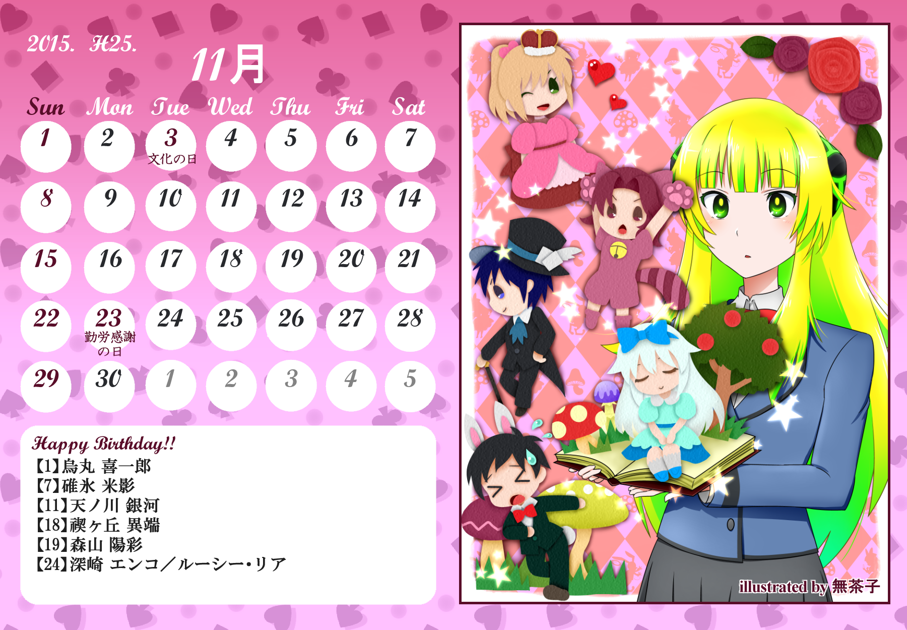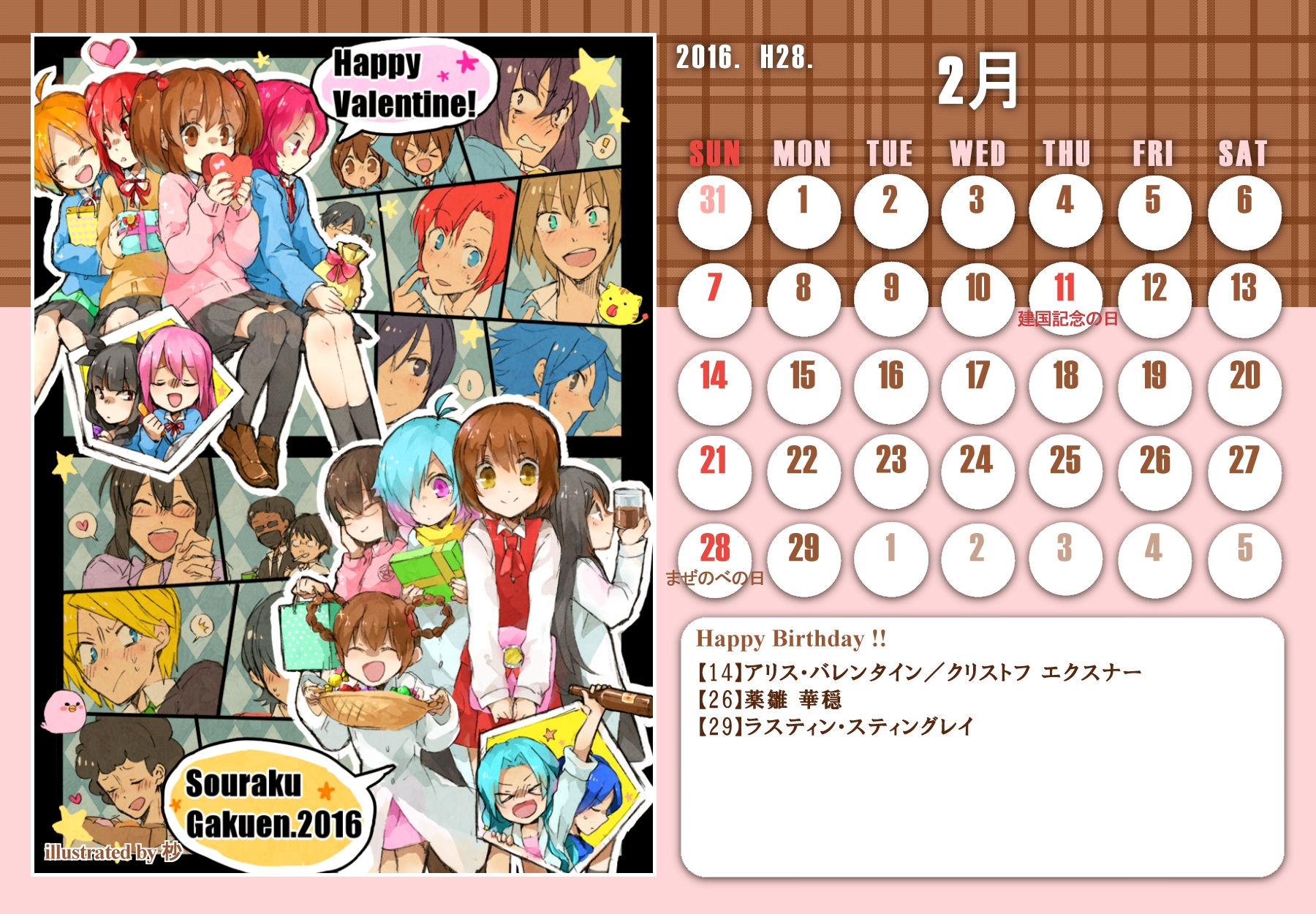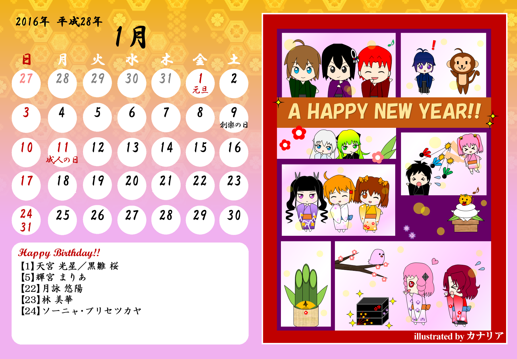 【完成】まぜのべカレンダー2015! 完成品 2015年03月30日 皆様方のご参加およびご協力により、まぜのべカレンダー2015が完成しました!完成品は下の「つづきはこちら」を展開で掲載しておりますので、ご確認ください! その際、以下の使用上の諸注意をご一読いただきますようお願いいたします。【使用上の諸注意】まぜのべカレンダー企画(まぜレン企画)は一個人である無茶子が企画し、まぜまぜのべる内有志数名の参加と協力によって非公式に企画されたものです。 まぜまぜのべる運営さまとは一切関係ありませんので、ご了承ください。以下にこちらで配布するカレンダーを使用されるにあたっての重要な諸条項を記します。以下の条項に同意いただける方のみ、この条項の範囲内でご使用ください。(1)それぞれのカレンダーのイラスト部分の著作権はその月のイラストを描いて下さった方にあります。(2)使用する際はあくまで個人的使用の範囲に留めてください。こちらはフリー配布素材ではありません。⇒○例:印刷して部屋に飾る、PCのデスクトップ壁紙にする⇒×例:自分のHPに無断で掲載する、pixiv等のSNSサイトに無断で投稿する、何らかの素材として使用する (※但し今回は外部のテクスチャ素材などを使用しておりませんので、イラストを描いた絵師さんの了承がとれた場合は、この限りではありません)【お詫びとお知らせ】当初は全てpng形式で上げようと思っていたのですが、一部アップロード上限の関係でjpegになってしまったものがあります。もしご希望があればメール等でpngをお送りしますので、お申し付けください。以上にご了承頂けましたら、つづき展開をお願いします! ※画像はクリックで原寸大表示します! ▼表紙 2015年バージョンも、にぎやかな表紙になりました! ▼2015年3月:イラスト担当フジムラ 春と桜とにゃんこと美少女!眼福でございます! 二人が創楽に入学し、今後の活躍も楽しみですね!! ▼2015年5月:イラスト担当ツナ 5月誕生日の面々、みんな楽しそう! 空とこいのぼりの青が清々しく爽やかです!! (ツナさん修正ありがとうございました!) ※修正一回(イラスト部分) ▼2015年6月:イラスト担当無茶子、アイデアすいそ 「陽向のお誕生日パーティーをテーマに描いてください!」 とすいそさんから言われて完成した後、ひなちゃんの誕生日は6月じゃないことが判明。 いいんです、いつ祝ったっていいんです!何度祝ったっていいんです!!w ▼2015年7月:イラスト担当フジムラ、アイデアカナリア、ゆのは、ねる カナリアさん、ゆのはさん、ねるさん、素敵なお題設定ありがとうございました! そしてイラストを一人で担当してくださったフジムラさん、ありがとうございました! ほのぼのとした雰囲気に癒されます!! ※修正一回(イラスト部分) ▼2015年8月:イラスト担当コタ。 差し込む日差しが夏の香りを醸し出してます! 金魚メイファも可愛く描いてくださってありがとうござます!! ▼2015年9月:イラスト担当ゆのは 創楽メンバーついに宇宙にまで進出の図! それぞれ楽しそうで素敵ですが、後ろを漂ってる(?)のはもしかして……ゴクリw ▼2015年10月:イラスト担当ねこらぶ 大運動会の予感!! 個人的には玉入れがツボです。ショボーンな表情がw ▼2015年11月:イラスト担当無茶子 読書の秋をテーマに描いていたのですが、最終的にはよくわからなくなりました。 飛び出す絵本を意識したことだけでも伝われば嬉しいです。 ▼2015年12月:イラスト担当ねる クリスマスの夜の素敵な情景。 でも雪の上に直接立ってしもやけにならないかが心配ですw ▼2016年1月:イラスト担当カナリア 賑やかなお正月、みんなの晴れ着姿が可愛いです! 鏡もちに鎮座するマルとらのさりげなさw ▼2016年2月:イラスト担当杪 チョコをあげる女の子も、もらう男の子(一部”子”じゃないけどw)も、 表情豊かで可愛いです!! ▼2016年3月:イラスト担当いたちょ子 菜花ちゃん、美樹ちゃん、こころちゃんの三人官女! 柔らかく繊細なタッチの色鉛筆での彩色が綺麗です。 + + + 皆様のご参加、ご協力、応援のおかげでこうしてカレンダーを形にすることができました。 本当にありがとうございました。 また後半は個人的な都合でバタバタしてしまい、イラスト提出や完成品の確認などでご連絡をくださった方にも個別にお返事をできず申し訳ありませんでした。 一応こちらが最終的な完成品になりますが、何か不備があればご連絡をいただければと思います。 その場合は随時、修正版を作り更新いたします。 来年も企画できたらいいなぁと思ってはいるのですが、どうなるか現時点では不明です。 もし企画することができた時には、ぜひご参加いただければ嬉しいです! 本当にありがとうございました!! PR