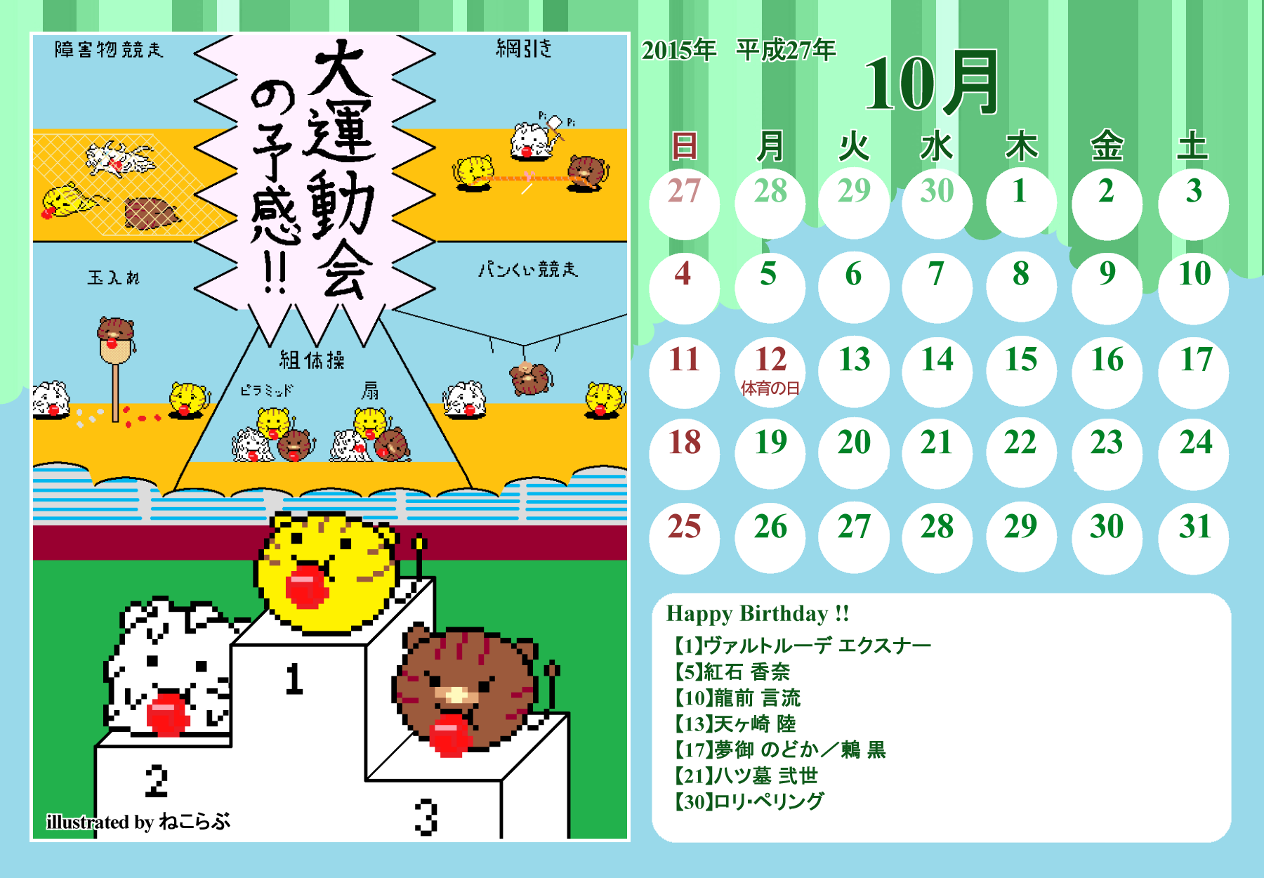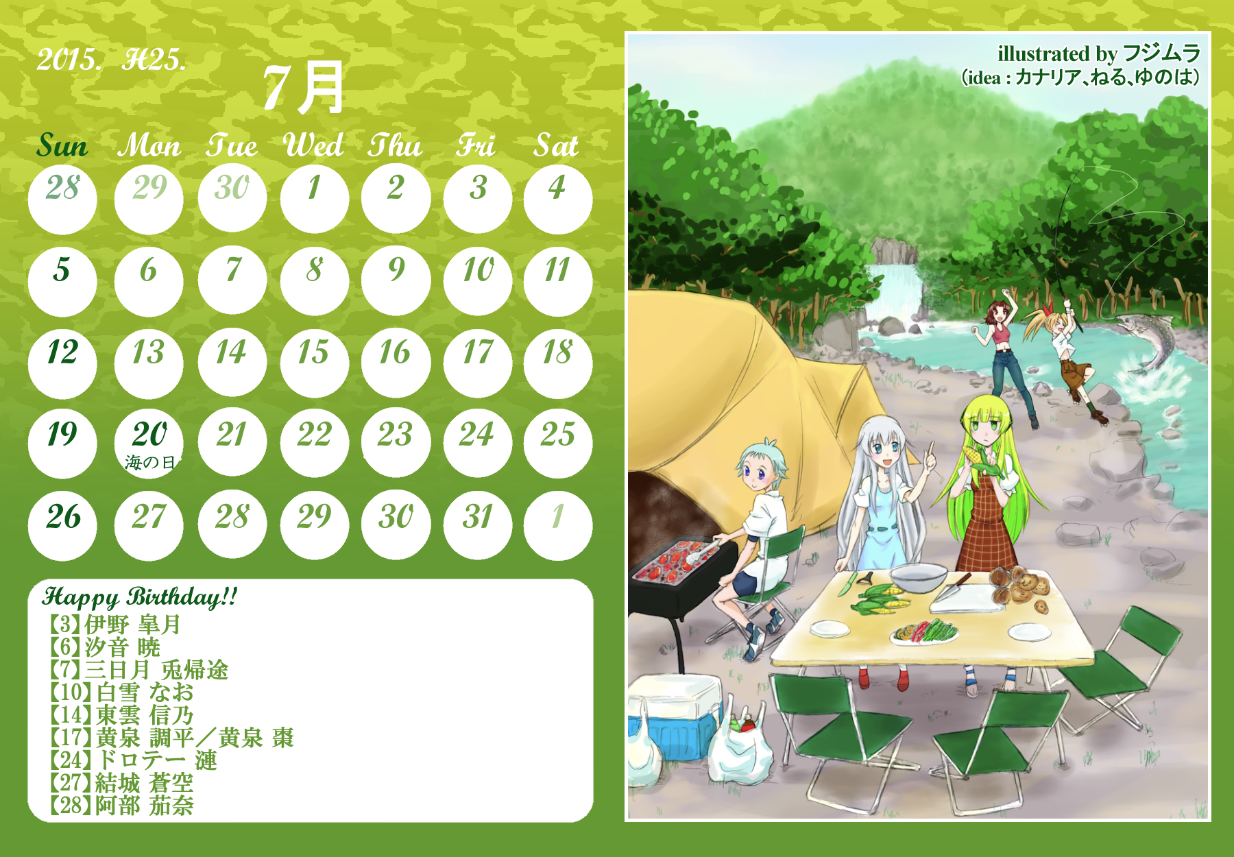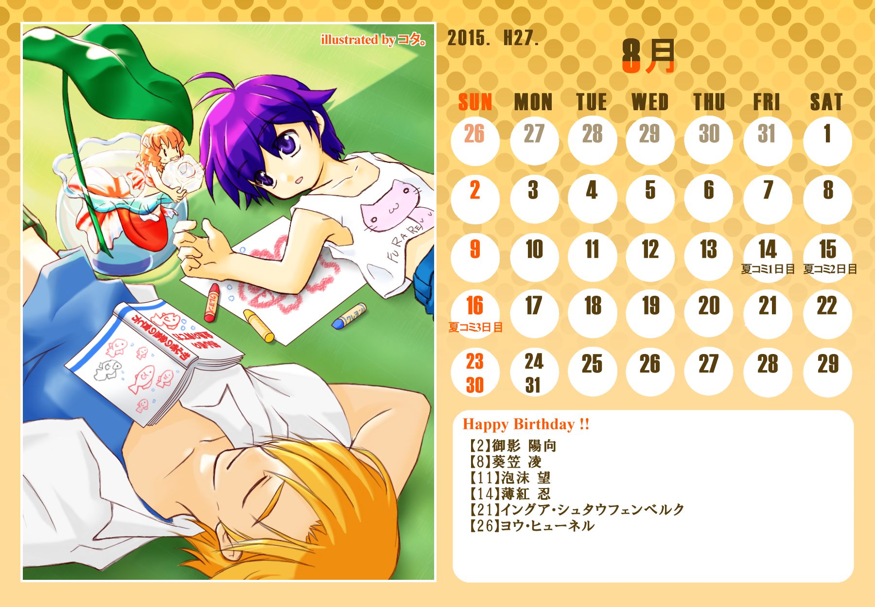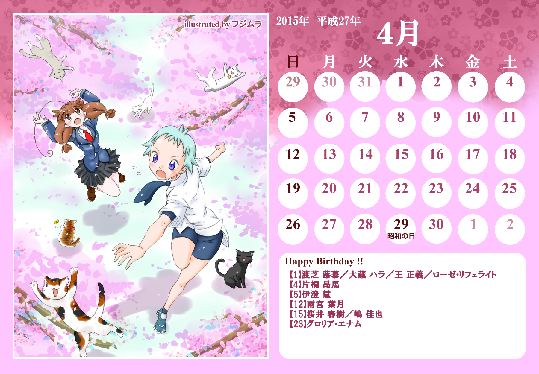 【完成】まぜのべカレンダー2015! 完成品 2015年03月30日 皆様方のご参加およびご協力により、まぜのべカレンダー2015が完成しました!完成品は下の「つづきはこちら」を展開で掲載しておりますので、ご確認ください! その際、以下の使用上の諸注意をご一読いただきますようお願いいたします。【使用上の諸注意】まぜのべカレンダー企画(まぜレン企画)は一個人である無茶子が企画し、まぜまぜのべる内有志数名の参加と協力によって非公式に企画されたものです。 まぜまぜのべる運営さまとは一切関係ありませんので、ご了承ください。以下にこちらで配布するカレンダーを使用されるにあたっての重要な諸条項を記します。以下の条項に同意いただける方のみ、この条項の範囲内でご使用ください。(1)それぞれのカレンダーのイラスト部分の著作権はその月のイラストを描いて下さった方にあります。(2)使用する際はあくまで個人的使用の範囲に留めてください。こちらはフリー配布素材ではありません。⇒○例:印刷して部屋に飾る、PCのデスクトップ壁紙にする⇒×例:自分のHPに無断で掲載する、pixiv等のSNSサイトに無断で投稿する、何らかの素材として使用する (※但し今回は外部のテクスチャ素材などを使用しておりませんので、イラストを描いた絵師さんの了承がとれた場合は、この限りではありません)【お詫びとお知らせ】当初は全てpng形式で上げようと思っていたのですが、一部アップロード上限の関係でjpegになってしまったものがあります。もしご希望があればメール等でpngをお送りしますので、お申し付けください。以上にご了承頂けましたら、つづき展開をお願いします! ※画像はクリックで原寸大表示します! ▼表紙 2015年バージョンも、にぎやかな表紙になりました! ▼2015年3月:イラスト担当フジムラ 春と桜とにゃんこと美少女!眼福でございます! 二人が創楽に入学し、今後の活躍も楽しみですね!! ▼2015年5月:イラスト担当ツナ 5月誕生日の面々、みんな楽しそう! 空とこいのぼりの青が清々しく爽やかです!! (ツナさん修正ありがとうございました!) ※修正一回(イラスト部分) ▼2015年6月:イラスト担当無茶子、アイデアすいそ 「陽向のお誕生日パーティーをテーマに描いてください!」 とすいそさんから言われて完成した後、ひなちゃんの誕生日は6月じゃないことが判明。 いいんです、いつ祝ったっていいんです!何度祝ったっていいんです!!w ▼2015年7月:イラスト担当フジムラ、アイデアカナリア、ゆのは、ねる カナリアさん、ゆのはさん、ねるさん、素敵なお題設定ありがとうございました! そしてイラストを一人で担当してくださったフジムラさん、ありがとうございました! ほのぼのとした雰囲気に癒されます!! ※修正一回(イラスト部分) ▼2015年8月:イラスト担当コタ。 差し込む日差しが夏の香りを醸し出してます! 金魚メイファも可愛く描いてくださってありがとうござます!! ▼2015年9月:イラスト担当ゆのは 創楽メンバーついに宇宙にまで進出の図! それぞれ楽しそうで素敵ですが、後ろを漂ってる(?)のはもしかして……ゴクリw ▼2015年10月:イラスト担当ねこらぶ 大運動会の予感!! 個人的には玉入れがツボです。ショボーンな表情がw ▼2015年11月:イラスト担当無茶子 読書の秋をテーマに描いていたのですが、最終的にはよくわからなくなりました。 飛び出す絵本を意識したことだけでも伝われば嬉しいです。 ▼2015年12月:イラスト担当ねる クリスマスの夜の素敵な情景。 でも雪の上に直接立ってしもやけにならないかが心配ですw ▼2016年1月:イラスト担当カナリア 賑やかなお正月、みんなの晴れ着姿が可愛いです! 鏡もちに鎮座するマルとらのさりげなさw ▼2016年2月:イラスト担当杪 チョコをあげる女の子も、もらう男の子(一部”子”じゃないけどw)も、 表情豊かで可愛いです!! ▼2016年3月:イラスト担当いたちょ子 菜花ちゃん、美樹ちゃん、こころちゃんの三人官女! 柔らかく繊細なタッチの色鉛筆での彩色が綺麗です。 + + + 皆様のご参加、ご協力、応援のおかげでこうしてカレンダーを形にすることができました。 本当にありがとうございました。 また後半は個人的な都合でバタバタしてしまい、イラスト提出や完成品の確認などでご連絡をくださった方にも個別にお返事をできず申し訳ありませんでした。 一応こちらが最終的な完成品になりますが、何か不備があればご連絡をいただければと思います。 その場合は随時、修正版を作り更新いたします。 来年も企画できたらいいなぁと思ってはいるのですが、どうなるか現時点では不明です。 もし企画することができた時には、ぜひご参加いただければ嬉しいです! 本当にありがとうございました!! PR