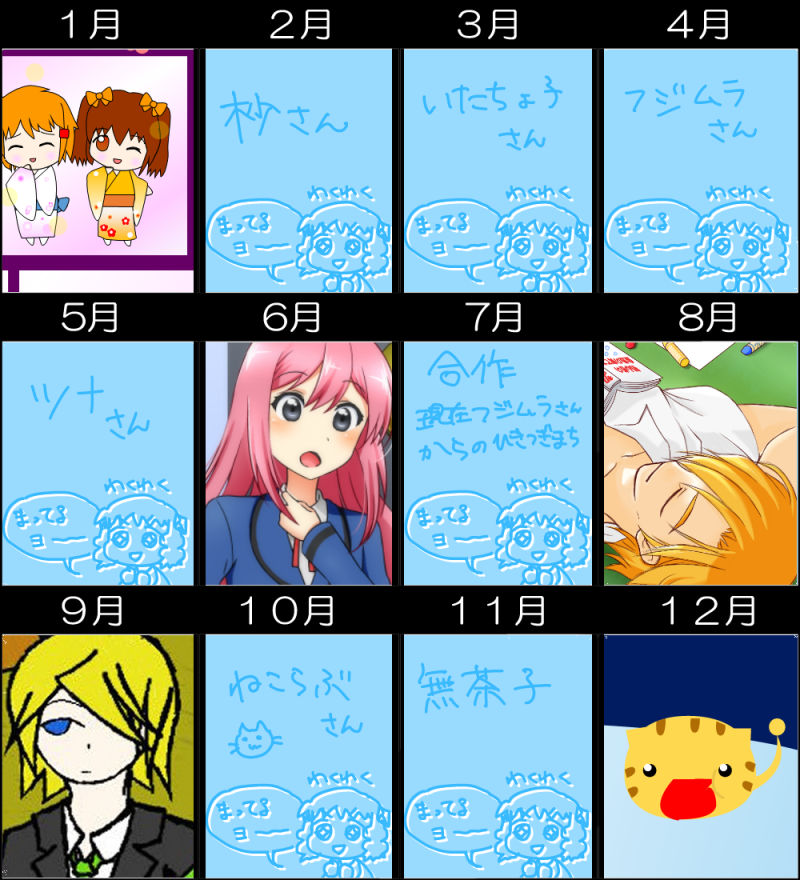 (1)それぞれのカレンダーのイラスト部分の著作権はその月のイラストを描いて下さった方にあります。